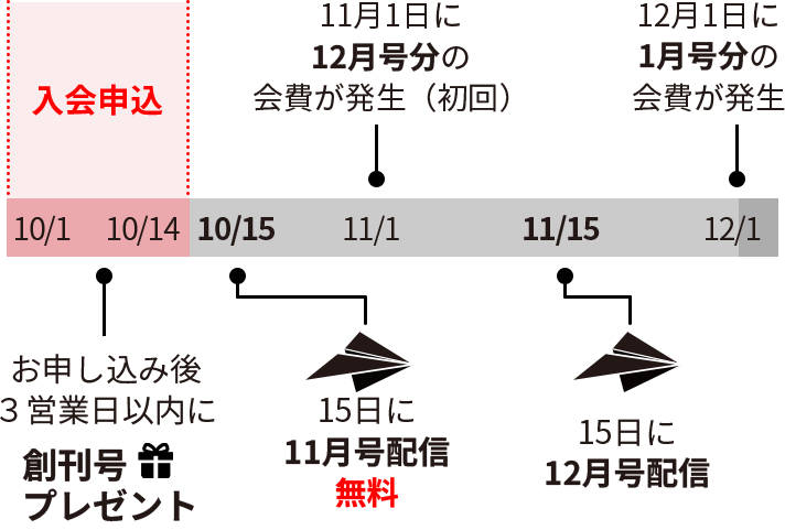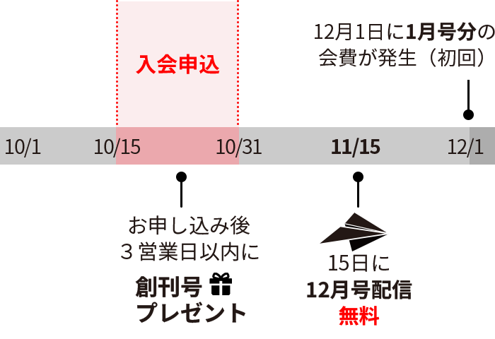 なお、いずれの場合もお申し込み後3営業日以内に創刊号を入会特典としてプレゼントいたします。